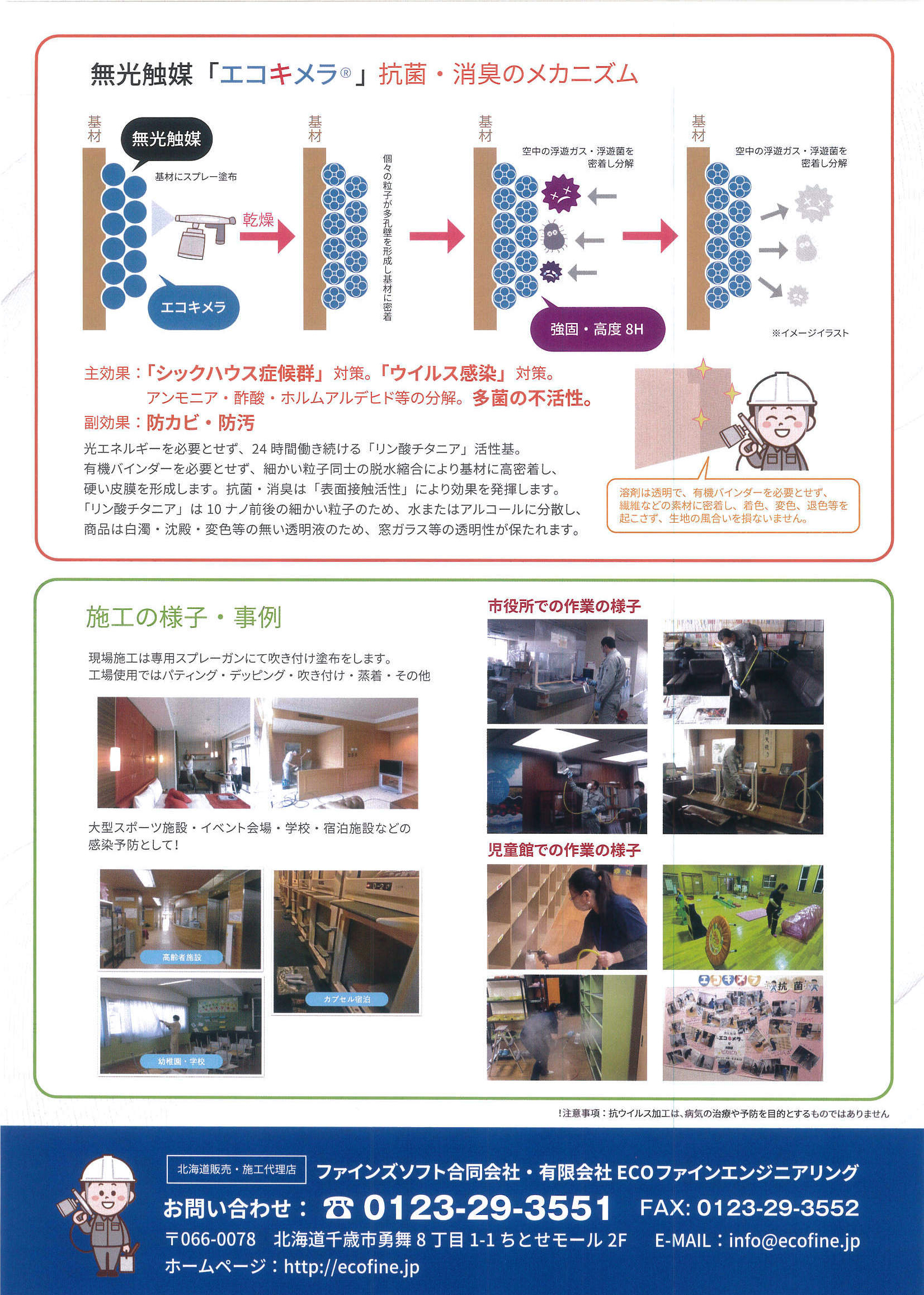 ※ 施工例では、北海道千歳市児童館での模様がこちらです。エコキメラで館内消毒しました。