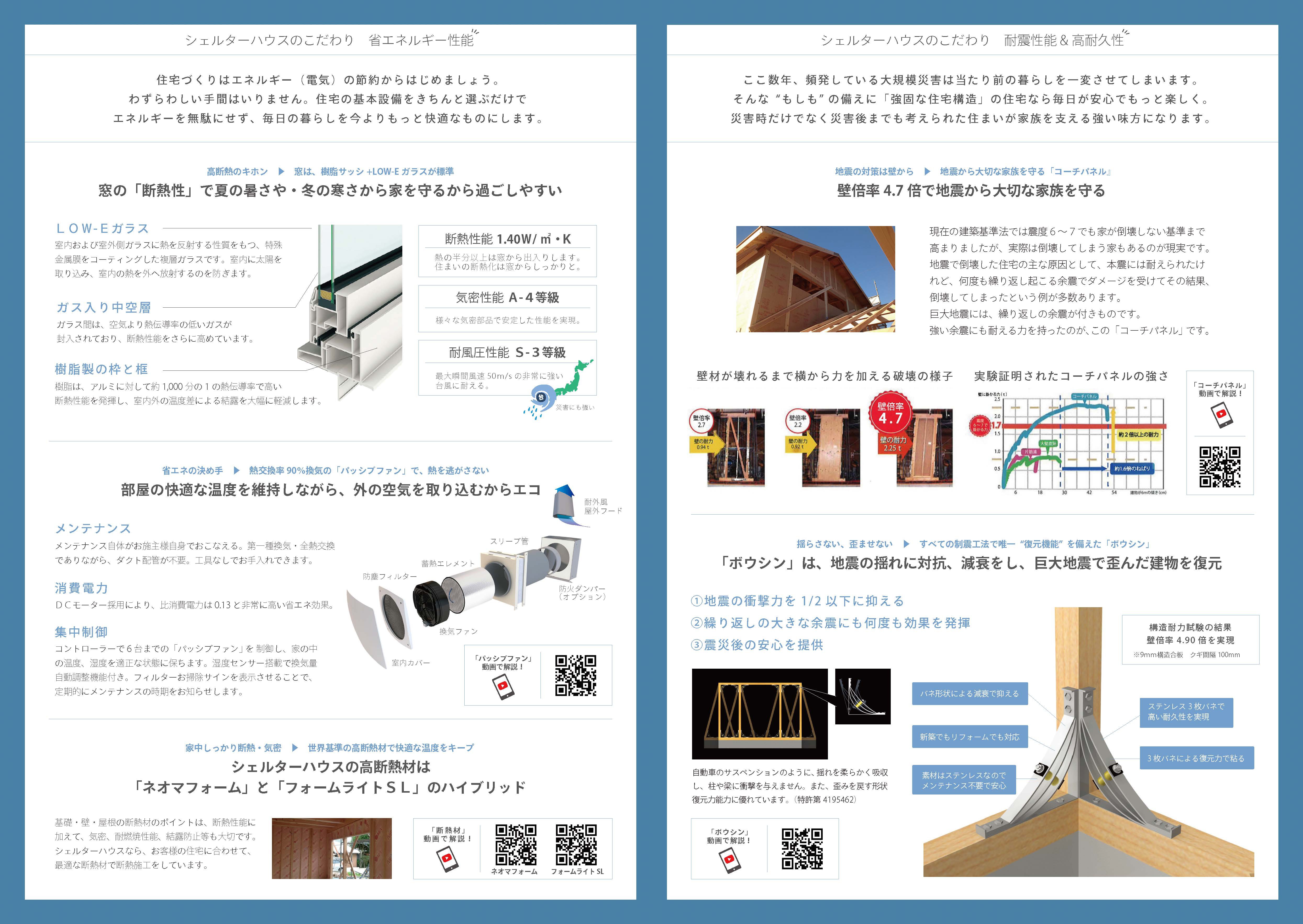 - A:制震装置を付けることで、地震の衝撃を1/2以下に抑えます。5回以上の繰り返し余震にも耐えます。また、コーチングパネル工法を採用することで、巨大な地震が来た際にも、パネル全体で力を分散させるモノコック構造であるため、従来の木造住宅にはない耐震性能を発揮いたします。 また、断熱性の高い樹脂製枠とガス入りLowーEガラスにおける、ペアサッチもトリプルサッシも驚きの価格でのサービスが可能です。また、デザイン性の高い建具も驚きの低価格です。