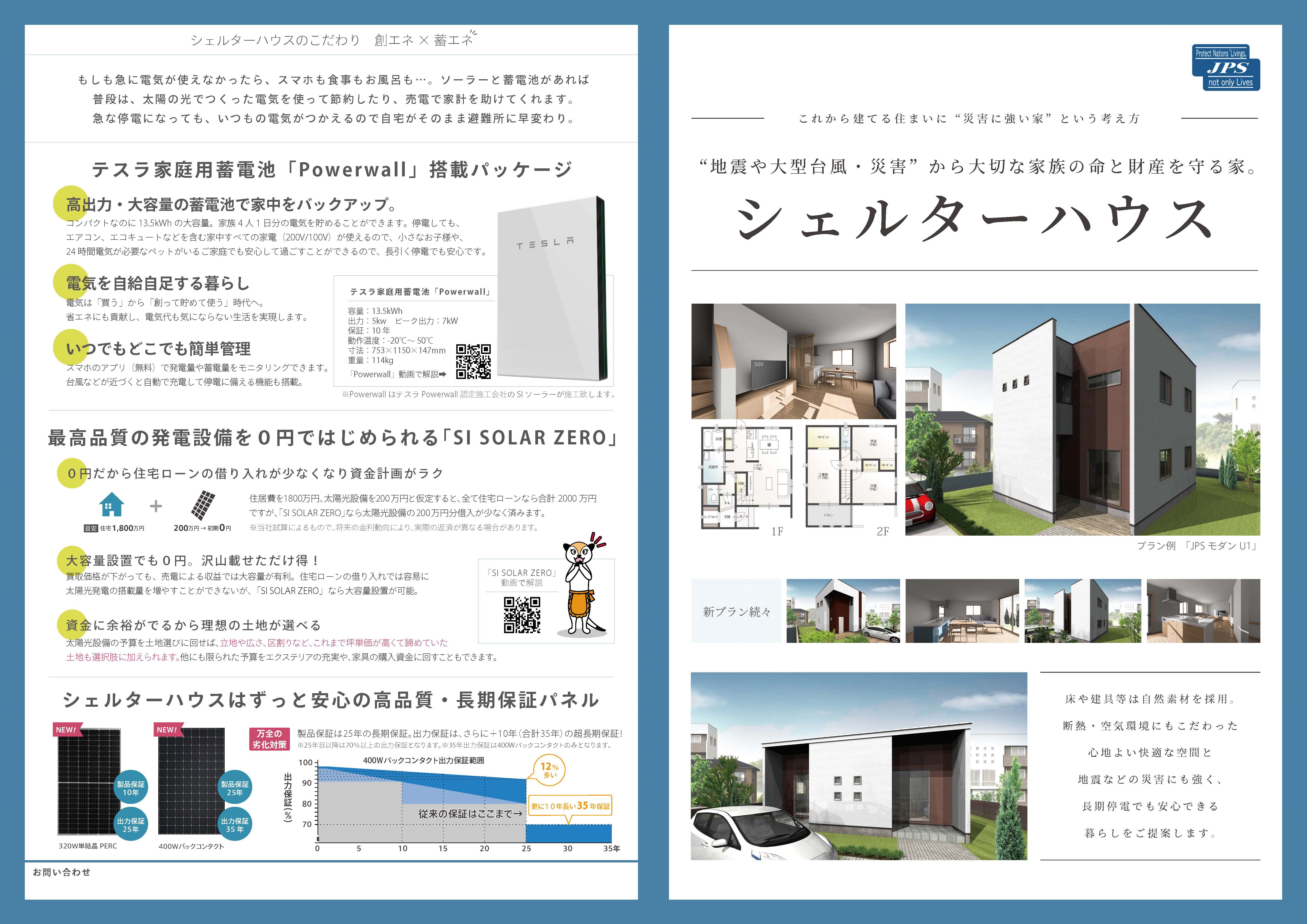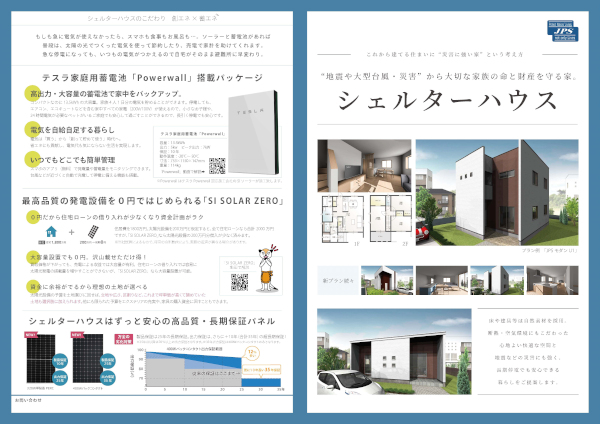 現在は日本や世界各地で様々な地球規模での災害が起こっています。もしもの災害時に、ご自身の建物を「シェルター」の役割として、”備あれば憂いなし”のごとく、災害から守ってくれたり、万が一災害に見舞われたとしても、現在の生活維持を務める手助けをしてくれる、そんな機能を備えた防災住宅「太陽光&蓄電池付」のことです。 |